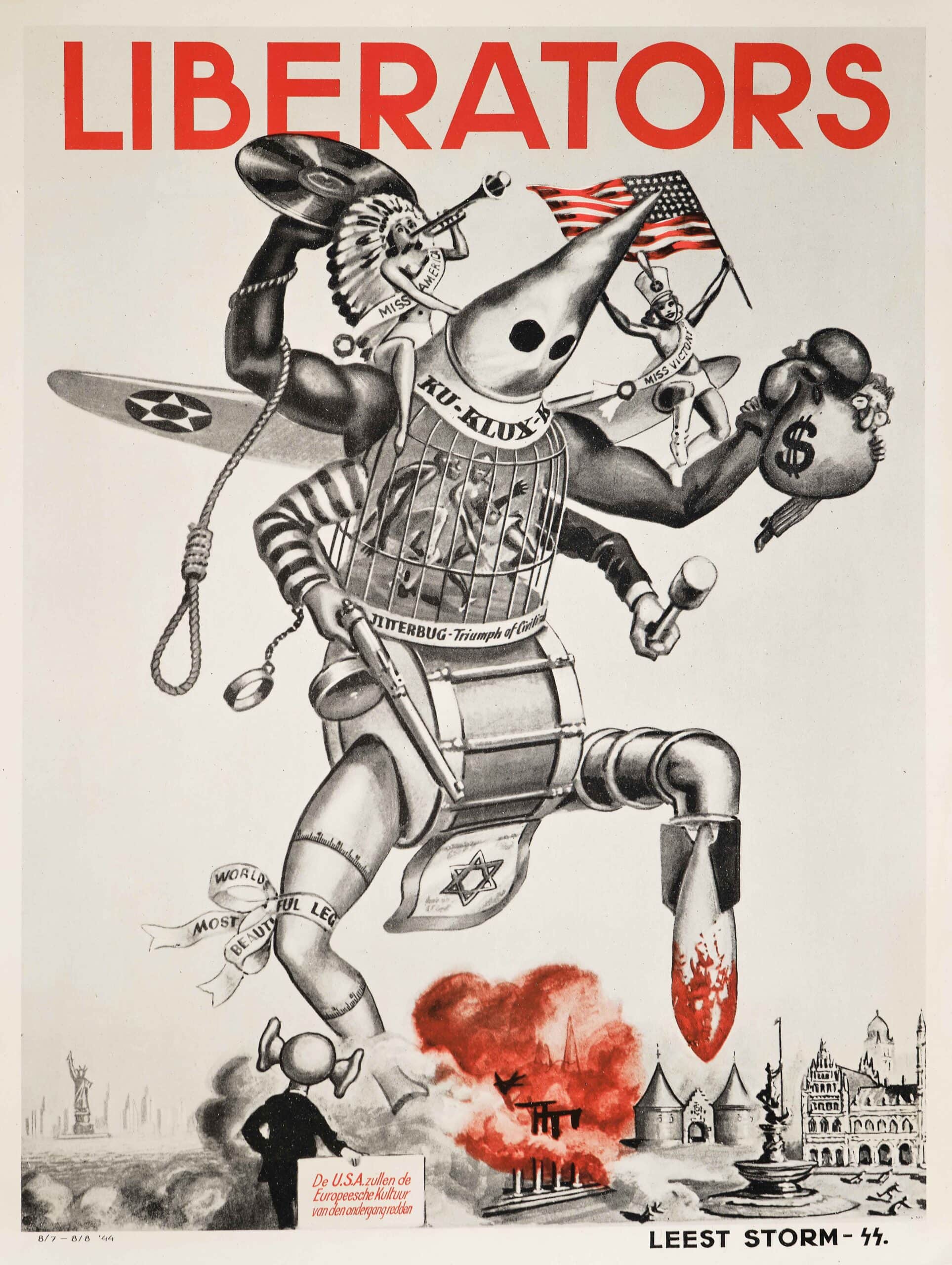 Harald Damsleth Liberators 1944. Sarcastic poster advises viewers to read Storm SS, a Dutch propaganda magazine. The composite monster is a Nazi version of American degeneration.the KKK, black culture (jazz), money grubbing, beauty pageants and Jewish culture. The insert reads: USA save our culture from destruction. Extremely rare. 28×22 near mint, conservation backed.