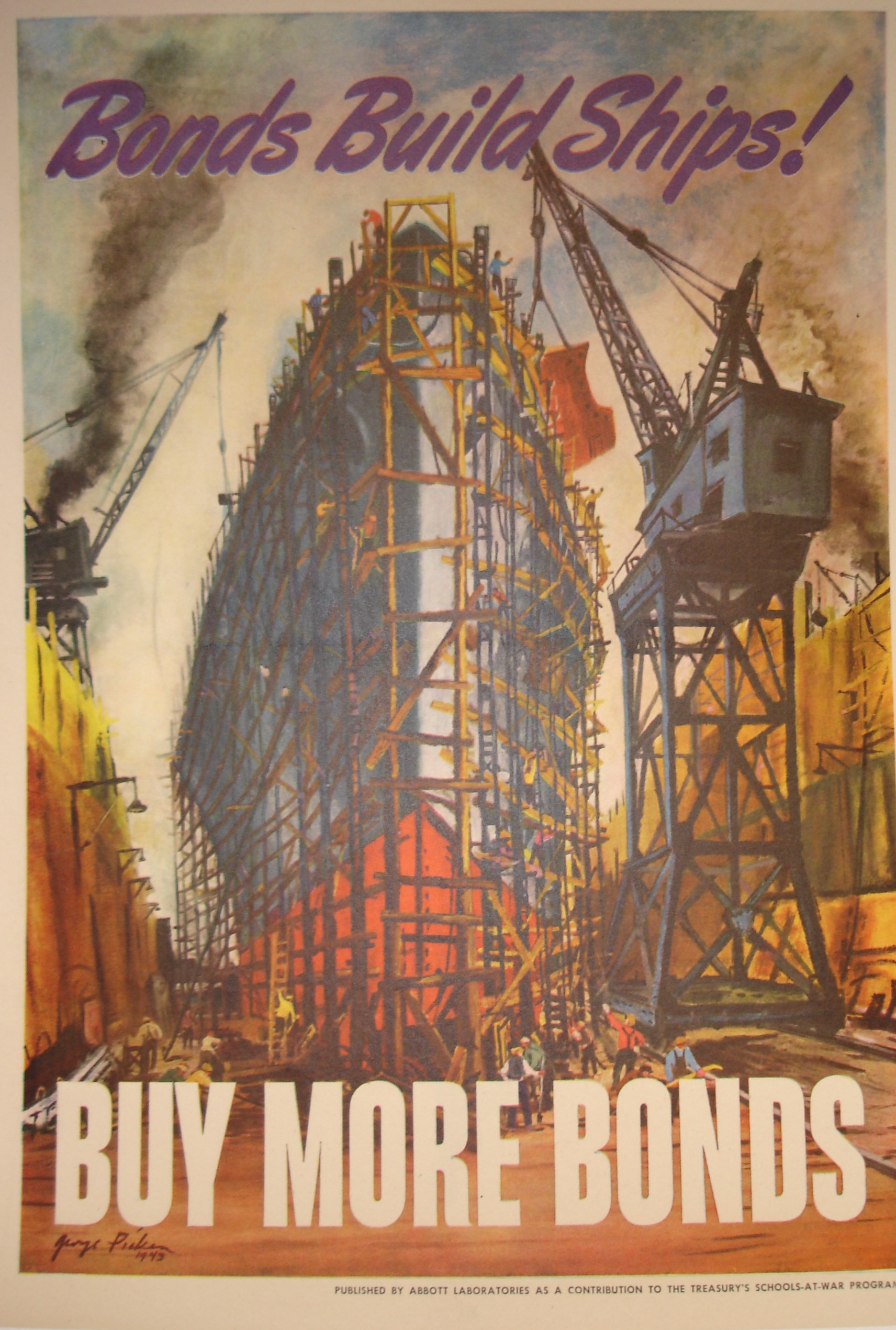George Pickens Bonds Build Ships! 1943. Your war bond money at work. Majestic hull rises in busy shipyard as a direct result of war bond financing. Enormous sums were needed to supply a navy that spanned several oceans. Privately printed by Abbott Labs. 16×11 near mint, conservation backed.